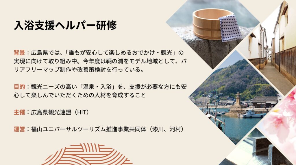 今回、私は福山・鞆の浦で開催された「入浴支援ヘルパー育成研修」に参加しました。